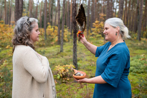 "Gespannt lausche ich, was uns erwartet und von diesem Moment an halten Bina und Sylvia einen so liebevollen, wertschätzenden und großen Raum für alle Prozesse, intimste seelische und körperliche Erfahrungen, dass ich tiefes Vertrauen fasse, mich so zu zeigen, wie ich wirklich bin. Der Wolf(f)sfrau in mir auf der Spur. Was für ein Geschenk.""